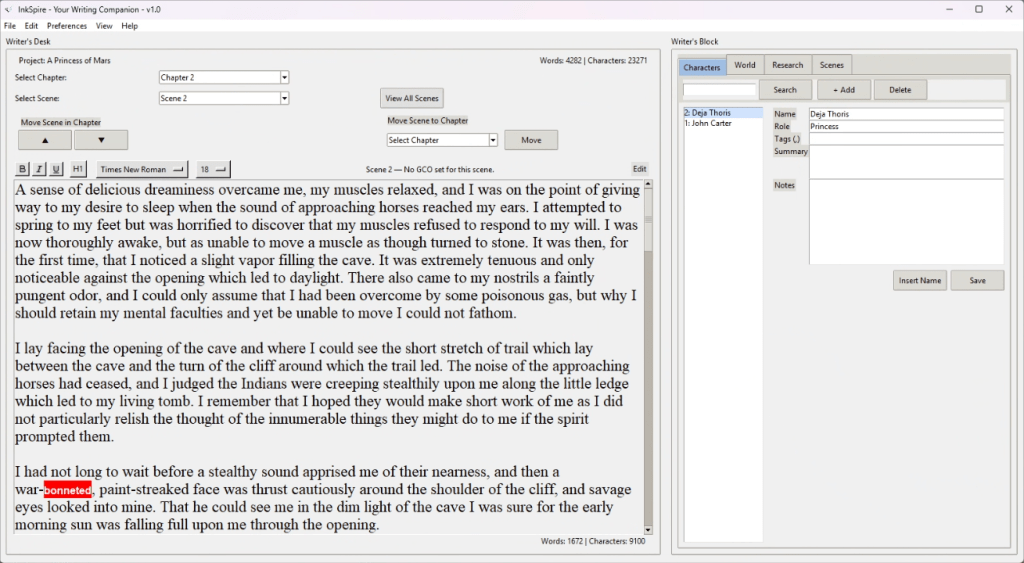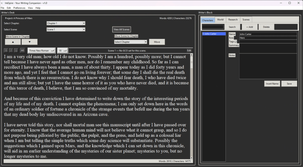 InkSpire is a focused, offline writing application built for authors who organize their work by projects, chapters, and scenes. It is designed to stay out of your way while giving you enough structure to manage long-form writing.