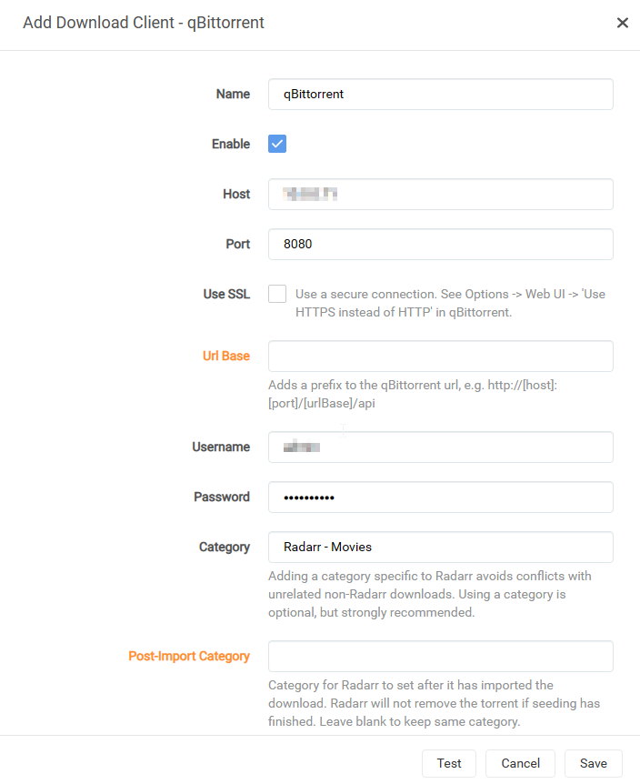 Give it a name and add the IP address for qBittorrent, like our example of 10.0.0.25. Leave it at http and 8080, unless you created a certificate. Add your username and password for qBittorrent and name the category the same as you did in the qBittorrent client. Click test and if you get a green checkmark you are set and can save it.