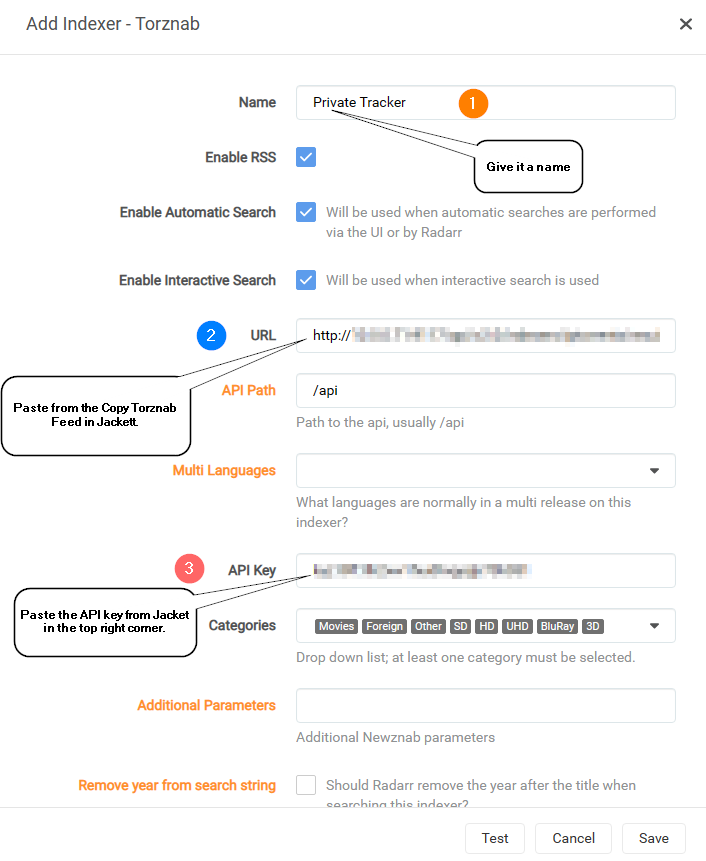 On this screen we will give it a name, paste the URL from Jackett and paste the API key from Jackett and then hit test