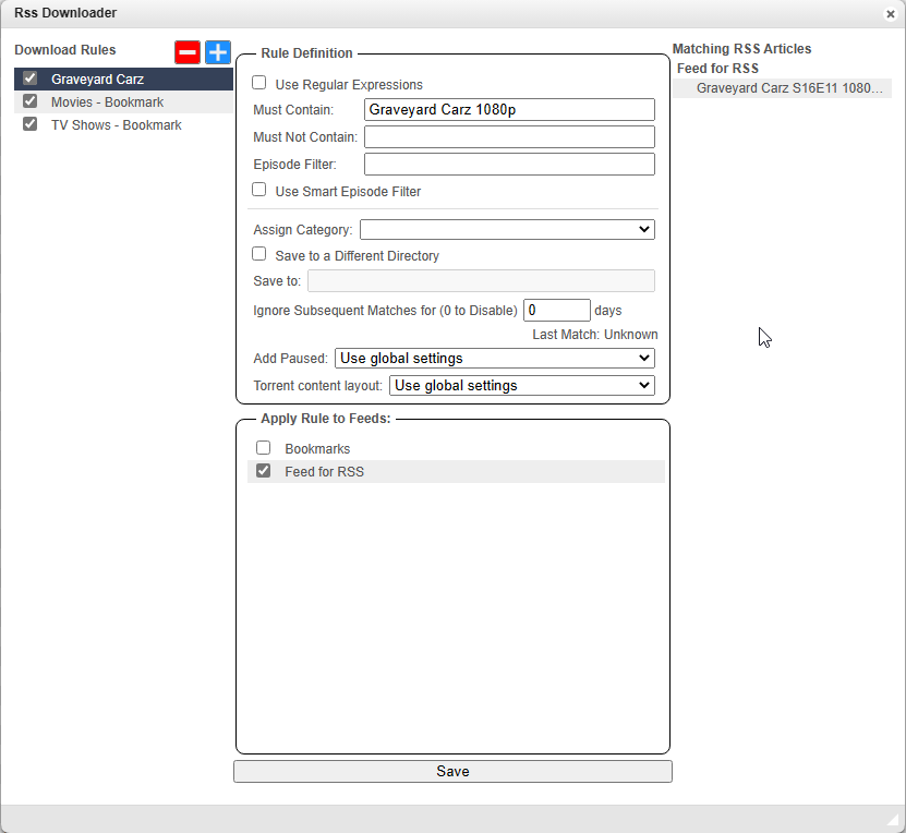In your rule definition you will type in the name of the show and any other requirements in the must contain. For example, I added 1080p. Then you select the feed you created in the Apply rule to feeds section. If there is a current match available it will show up on the right. If not, when one is added in the feed it will show up and auto-download.